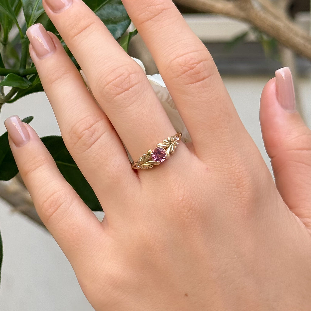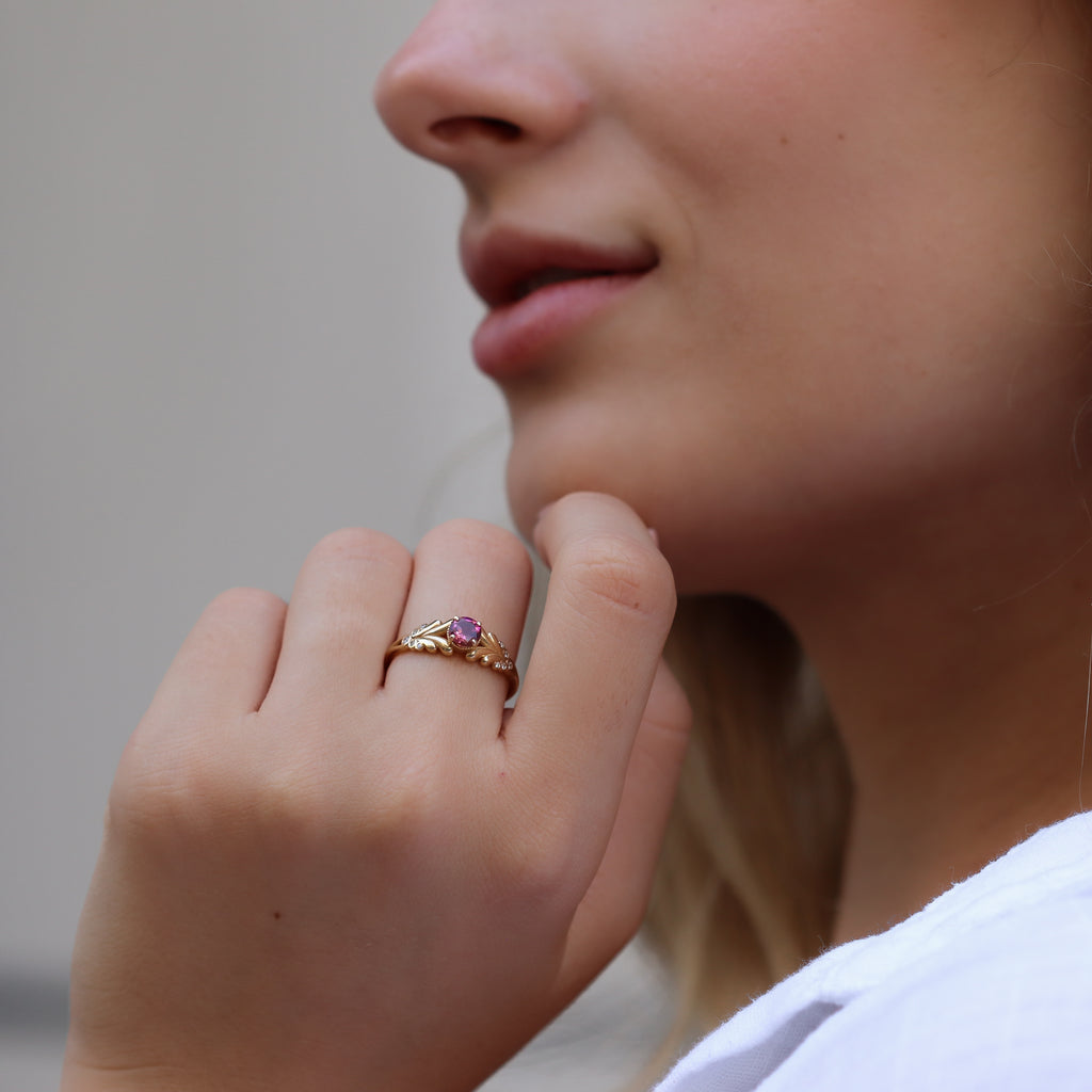 זהב צהוב 14K | אבן טורמלין ורודה טבעית ויהלומים טבעיים | 0.05 CT F VS