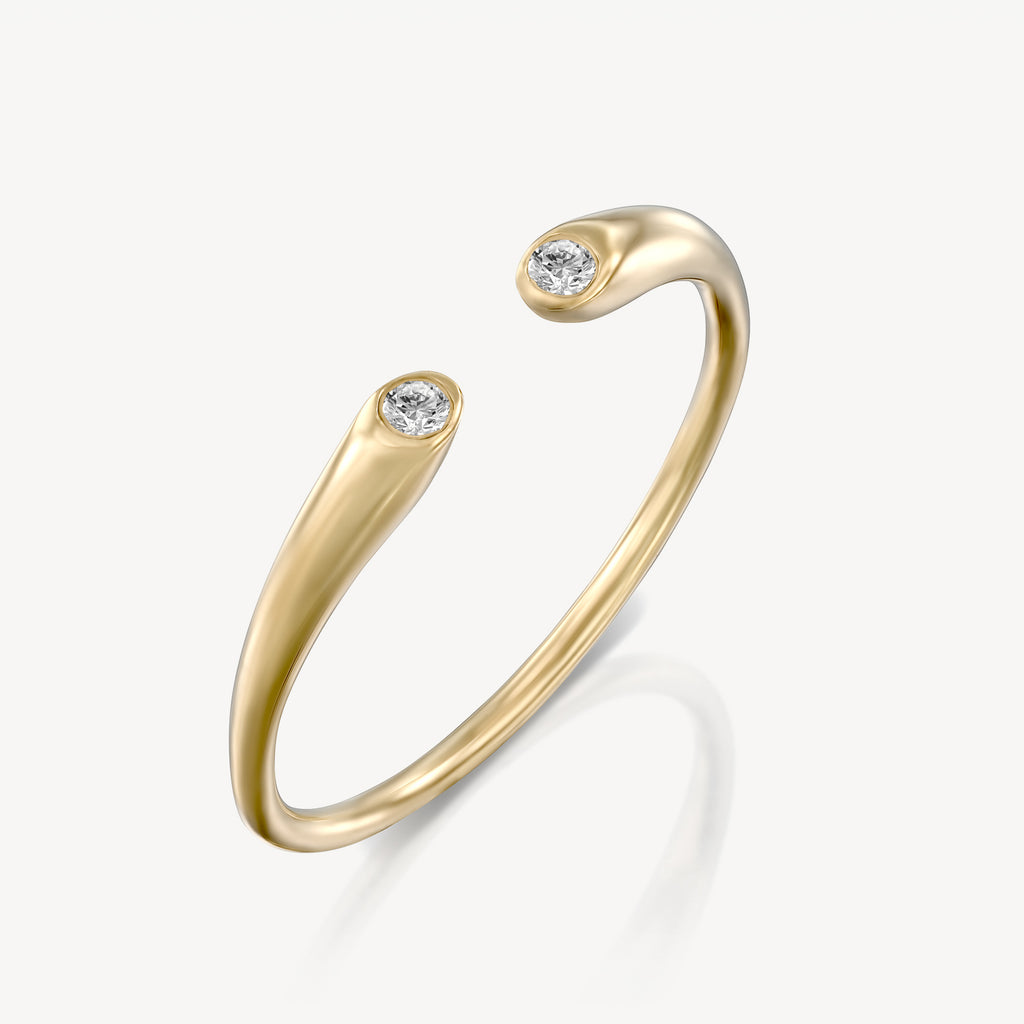 טבעת פתוחה, משובצת בשני יהלומים מנצנצים המעניקים לטבעת מראה נקי וזוהר.